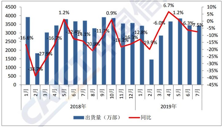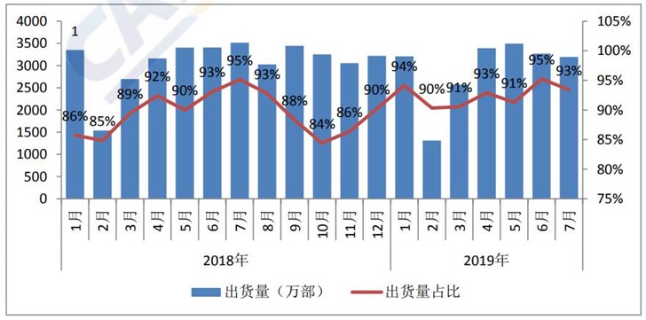 2019年7月,国产品牌手机出货量3194.2万部,同比下降9.2%,占同期手机出货量的93.4%。2019年7月,智能手机出货量3295.2万部,同比下降3.5%,占同期手机出货量的96.4%。