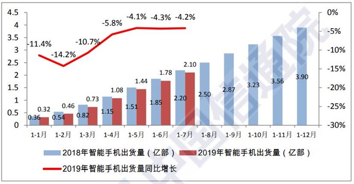 图4:2018年/2019年国内智能手机出货量及增长趋势