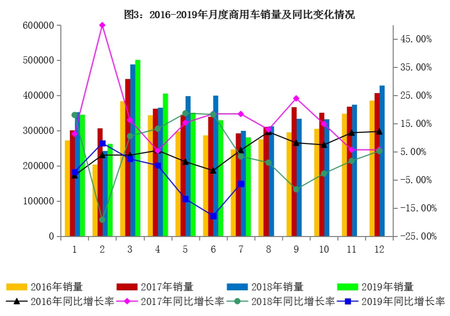 1-7月,商用车累计产销分别完成243.2万辆和247.7万辆,同比分别下降3.5%和4.4%。分车型产销情况看,货车产销同比分别下降3.1%和4.4%;客车产销同比分别下降7%和3.9%。