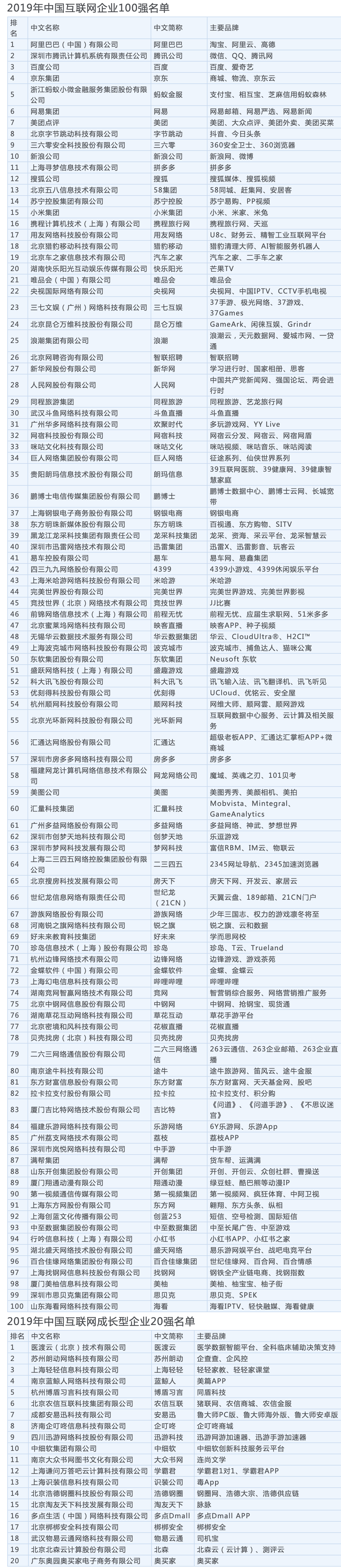 中国互联网协会、工业和信息化部网络安全产业发展中心(工业和信息化部信息中心)在2019年中国互联网企业100强发布会暨百强企业高峰论坛上联合发布了2019年中国互联网企业100强榜单、互联网成长型企业20强榜单和《2019年中国互联网企业100强发展报告》。阿里巴巴(中国)有限公司、深圳市腾讯计算机系统有限责任公司、百度公司、京东集团、浙江蚂蚁小微金融服务集团股份有限公司、网易集团、美团点评、北京字节跳动科技有限公司、三六零安全科技股份有限公司、新浪公司位列榜单前十名。