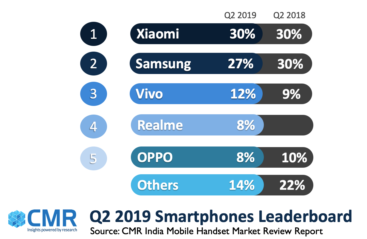 根据CMR发布的2019年第二季度印度移动手机市场报告,印度智能手机市场的整合日益加剧,排名前五的智能手机供应商占印度智能手机销量的6/7。