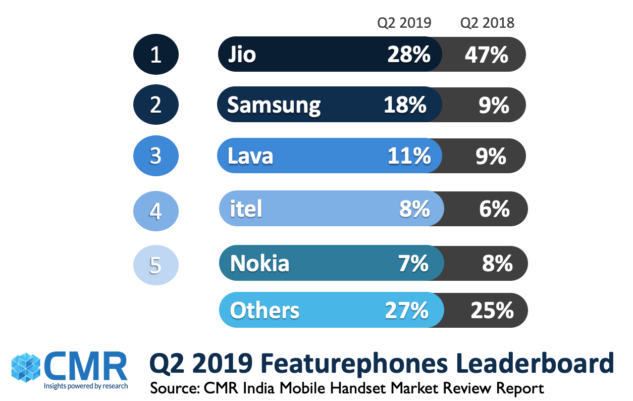 在JioPhone需求下降的推动下,印度功能手机市场同比大幅下滑约27%。与2018年第二季度相比,JioPhone的发货量同比下降56%。另一方面,三星、Lava和ITEL在2019年第二季度实现了正增长。诺基亚的出货量同比下降了21%。