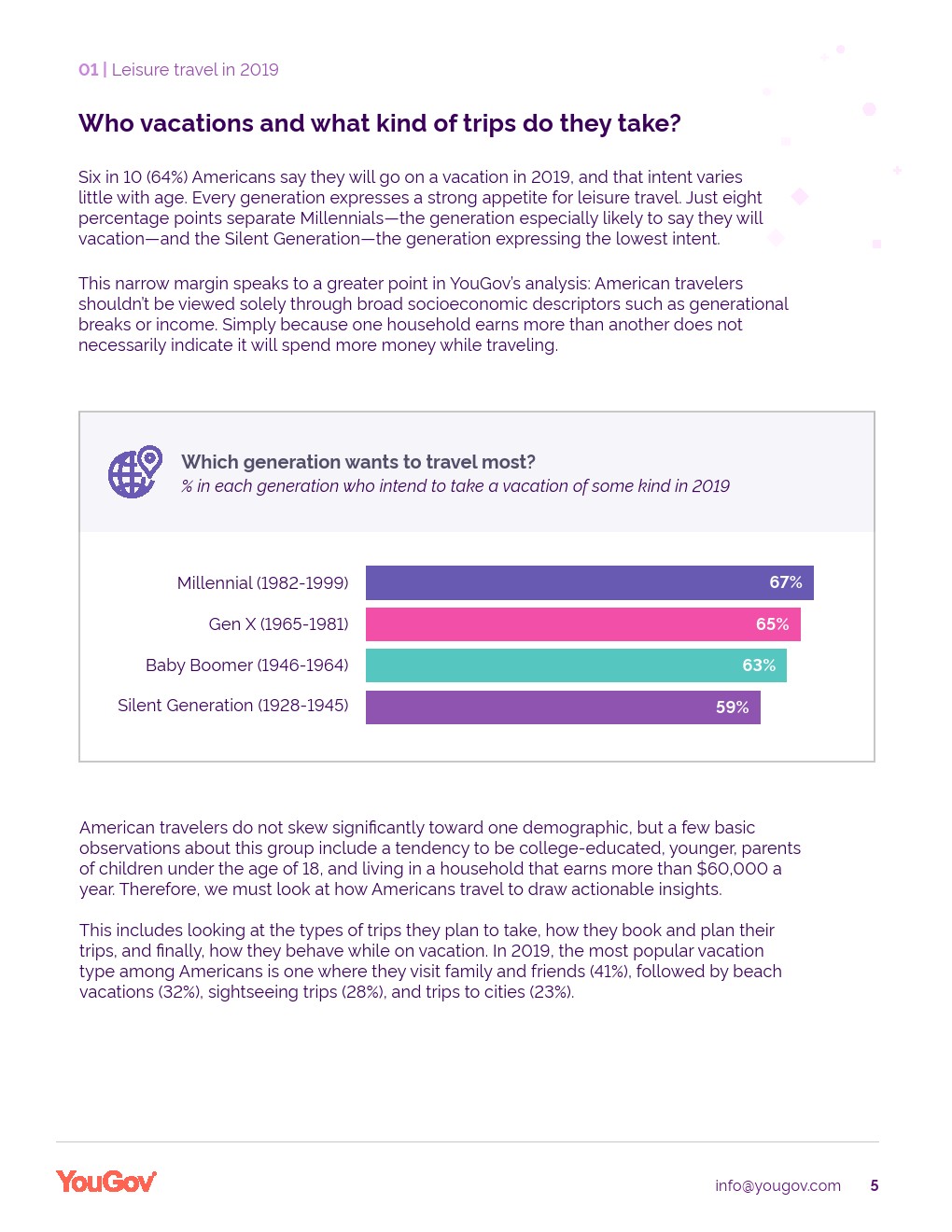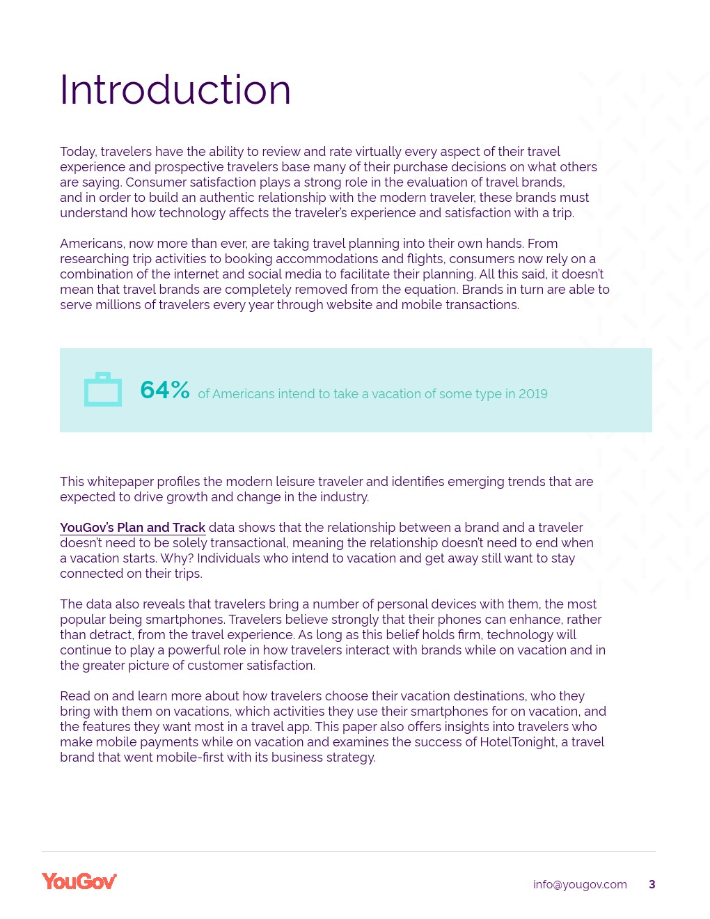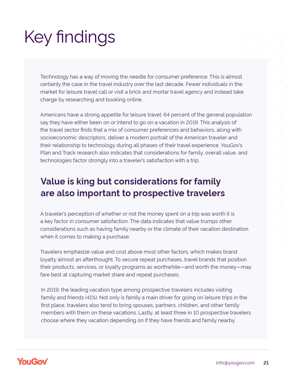 YouGov发布了“旅游科技报告”。美国人对休闲旅游的胃口很大,64%的美国人已经或打算在2019年度假。YouGov的研究还表明,对家庭、总体价值和技术的考虑对旅行满意度有很大影响。