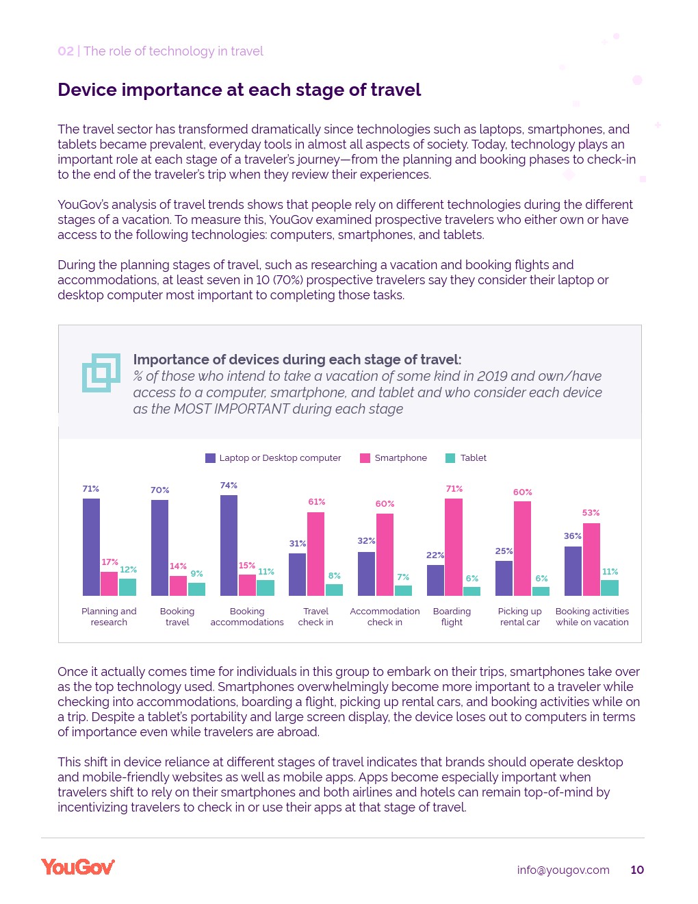 技术几乎在旅行者购买旅程的每一步都扮演着重要的角色。了解消费者在每个阶段更喜欢的具体技术将告诉品牌如何最好地接触这些群体,如,计划和预订阶段的电脑,上路和旅行回来后的智能手机,。