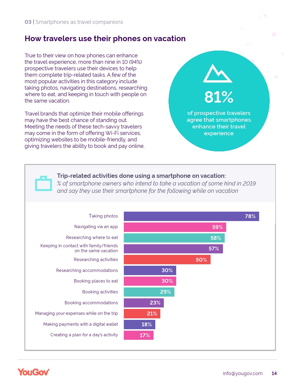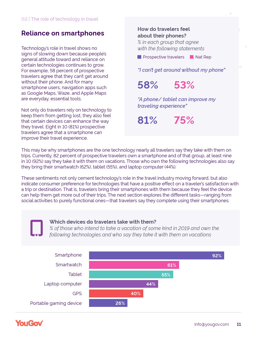 至少9/10的潜在旅行者(92%)度假时会随身携带智能手机。这样做会激发旅行者强烈的功利感:81%的消费者表示智能手机可以增强他们的旅行体验。