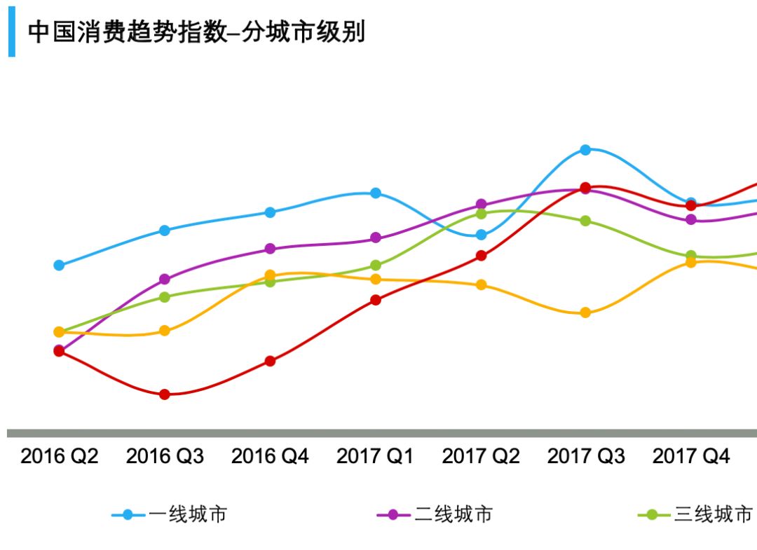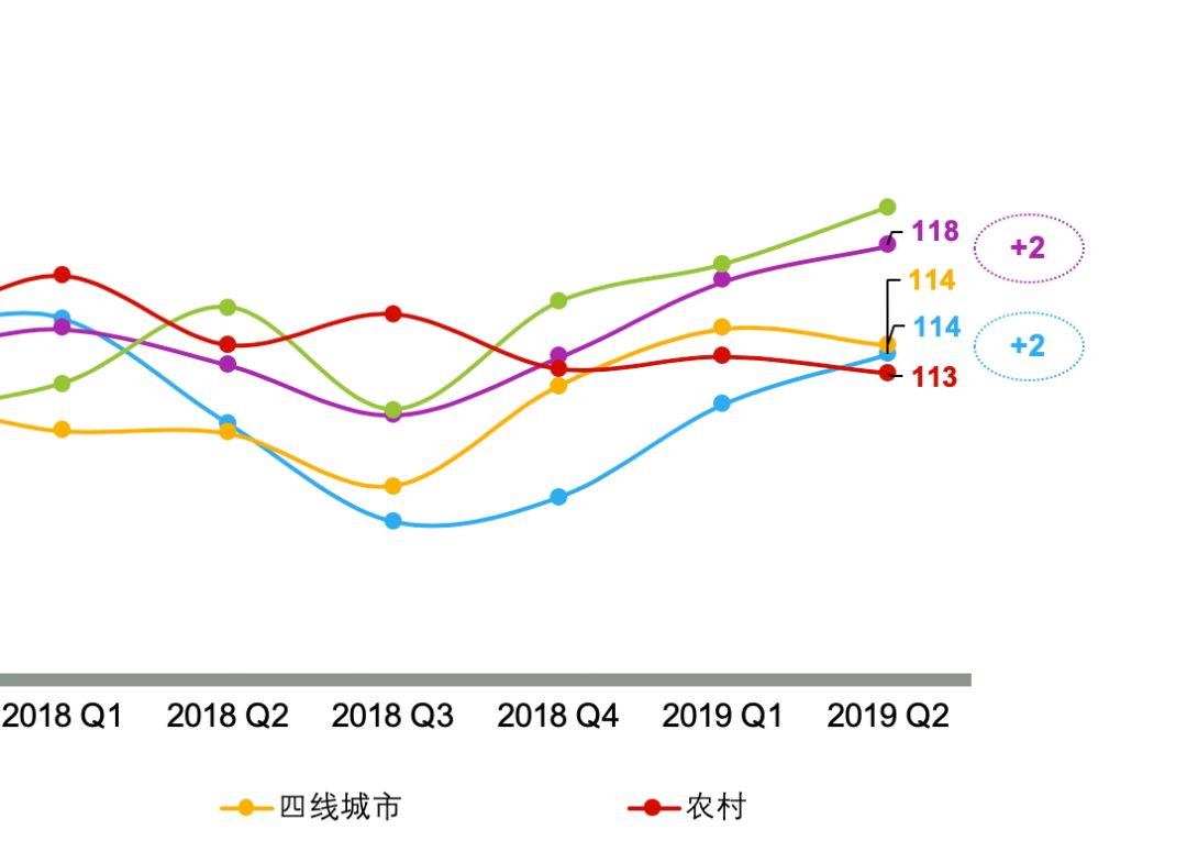 从不同级别城市来看,一、二、三线城市的消费趋势指数均实现了近四个季度的稳步增长,近半年增幅更为显著。其中,二、三线城市消费趋势指数持续领跑,分别为118点、120点,分别上涨1个点和3个点。一、四线城市紧随其后,均为114点。农村区域保持平稳,为113点。