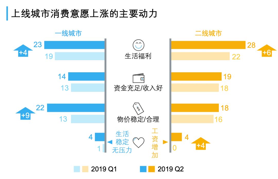 尼尔森研究发现,个人经济情况和消费意愿的提振带动了一、二、三线城市消费趋势指数的增长,其中,三线城市的个人经济情况和消费意愿表现亮眼,分别跃升6个点和2个点,达到了78点和70点。一线城市的个人经济情况较上季度增长4个点,为78点,消费意愿保持稳定,为65点。二线城市的个人经济情况也实现了小幅上扬,提升1个点,为78点,消费意愿为68点,较上季度增长2个点。