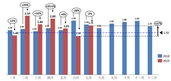2019年8月10日,中国汽车流通协会发布2019年7月份“汽车经销商库存”调查结果:7月份汽车经销商综合库存系数为1.75,同比下降2%,环比上升27%,库存水平位于警戒线以上。