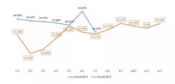 1-7月份二手车转籍总量为240万辆,转籍比例为29.72%,与去年同期相比增长了5.14个百分点。