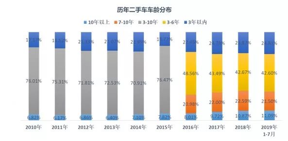 可以看到车龄在6年以内的车型占了总交易量的64.58%。另外,车龄在10年以上的车型比例与去年同期相比有小幅度增长,2019年7月共实现交易14.99万辆。