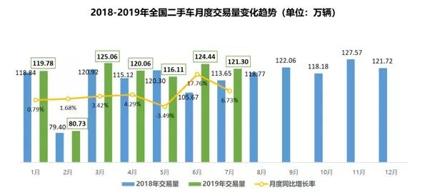 从2019年各月度交易走势来看,除了5月份同比出现小幅下降以外,整体呈现缓慢持续增长趋势。7月全国二手车交易量为121.3万辆,同比增长6.73%,较6月份增速明显减缓。