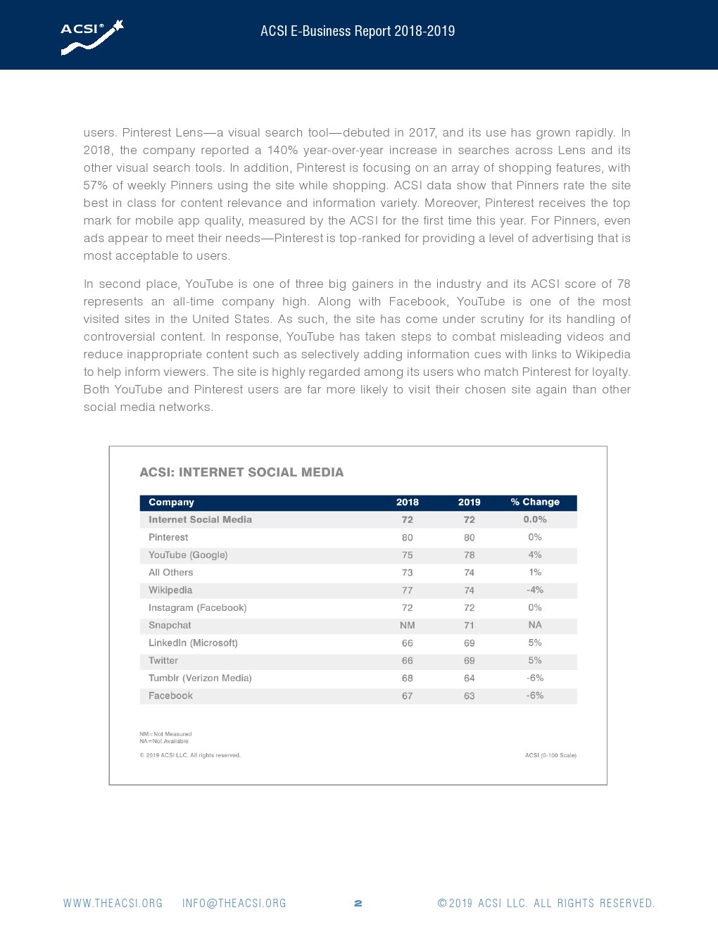 Pinterest今年再次获得了社交媒体平台中最高的客户满意度(80分),与前一年持平。Pinterest的用户规模相对较小,皮尤的报告称,仅有1/4的美国成年人(28%)使用该平台。相比之下,用户第二满意的社交媒体平台YouTube在美国的普及率达到73%。YouTube的满意度得分为78分,比2018年上升了3分(4%)。