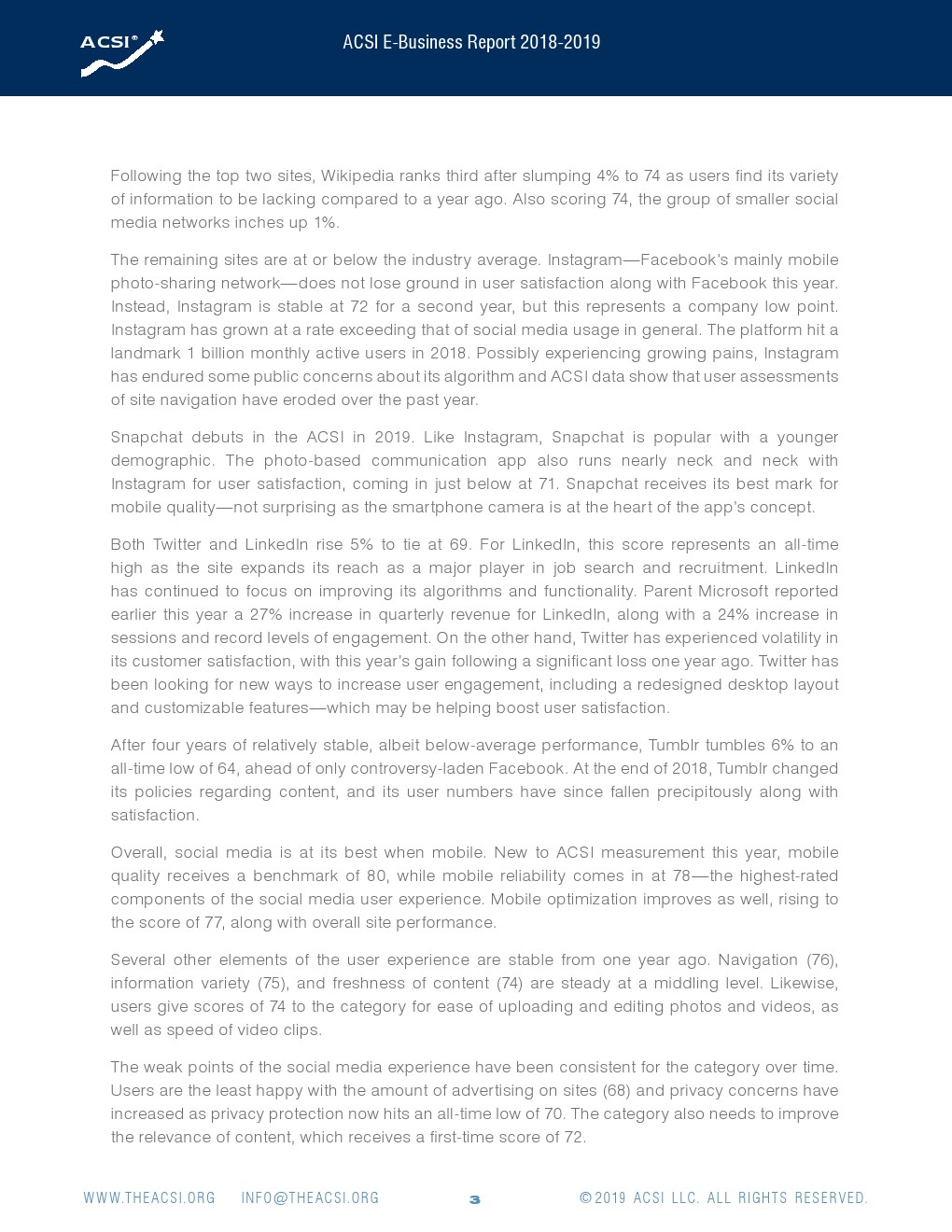Facebook在所有被测试的社交平台中拥有最低的用户满意度,得分63,比去年下降4分(6%)。
