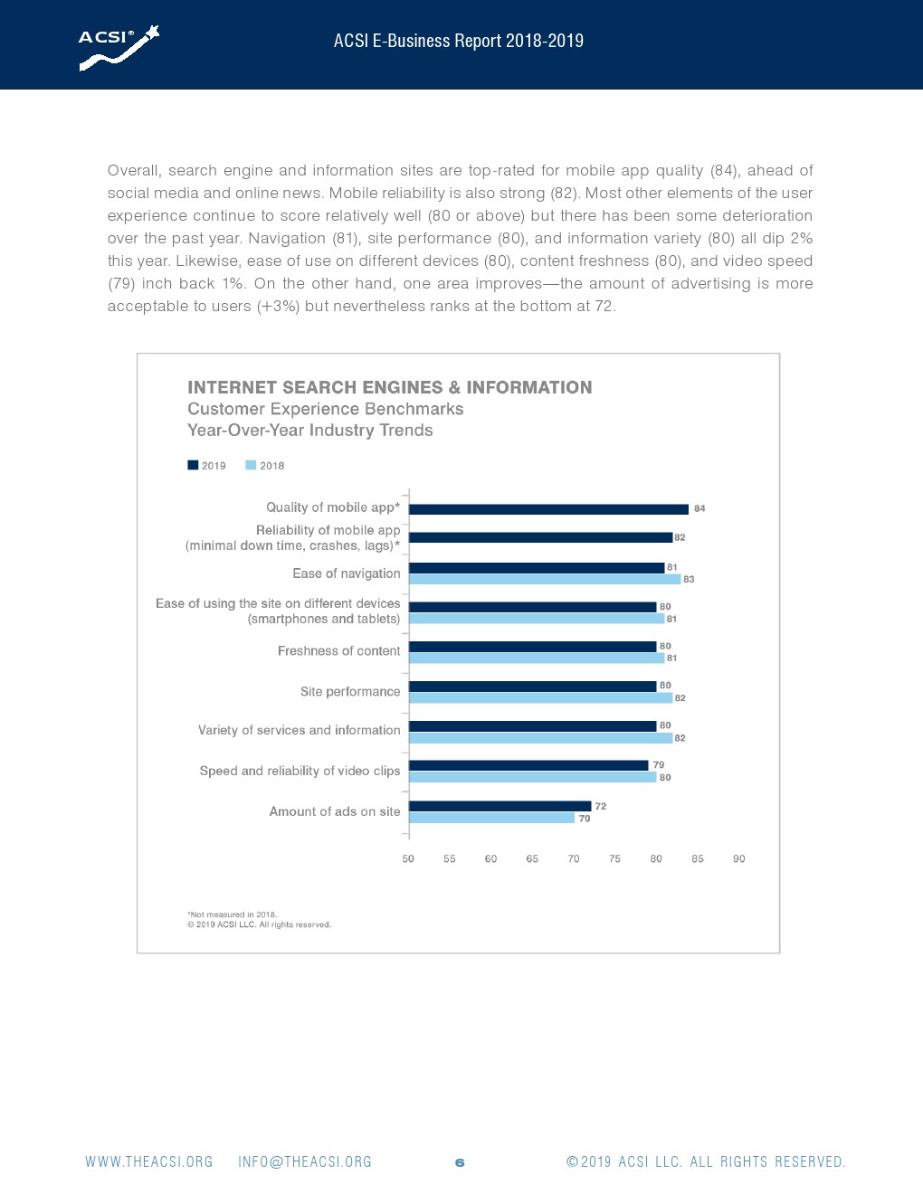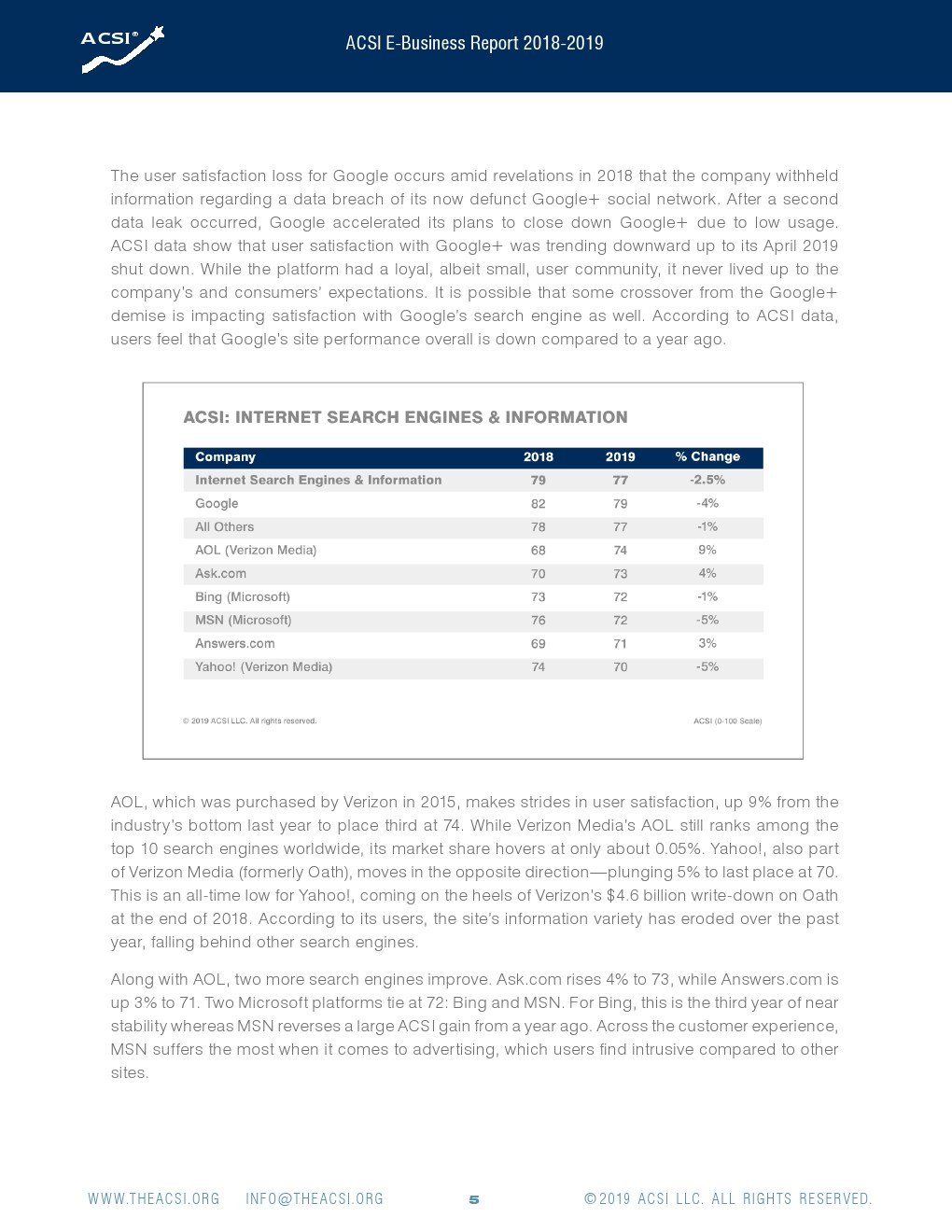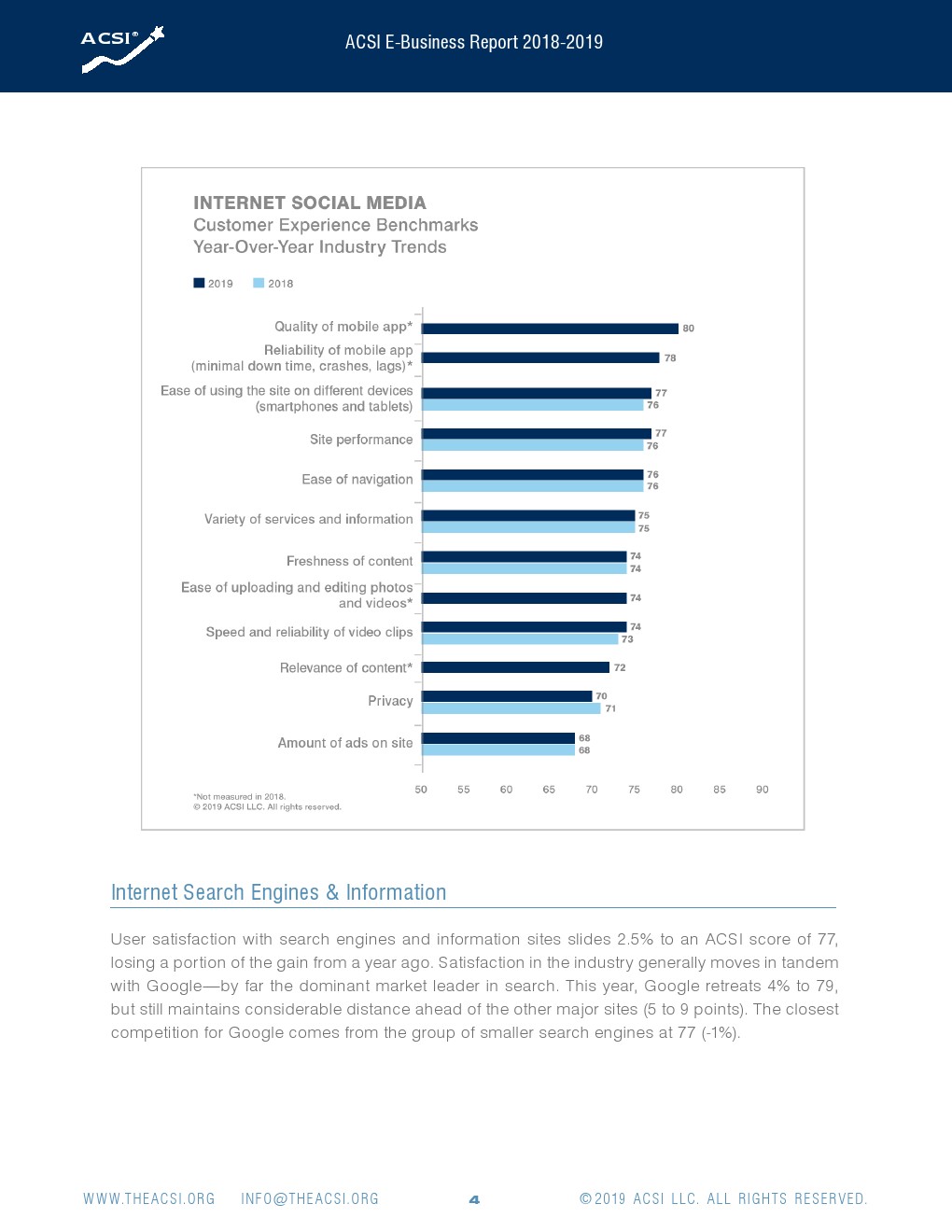 用户对搜索引擎的满意度上升了3%。在2019年用户满意度下降了2分,降至77分。谷歌的用户满意度评分也下降了3分,降至79分,报告将此归因于其已经停止的Google+社交网络曾发生过两次数据泄露。