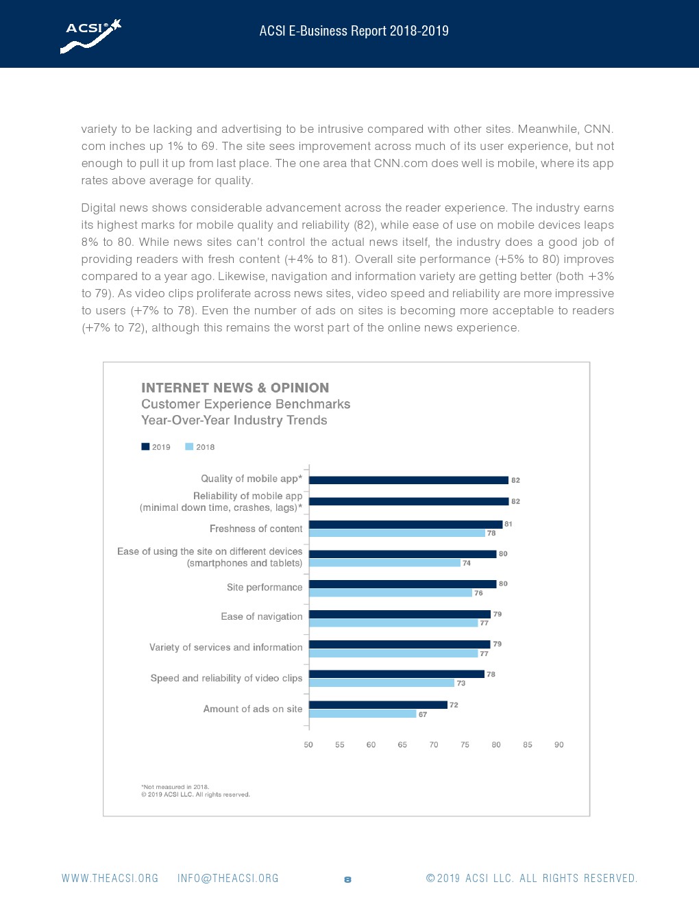 用户对网站性能(77)和导航易用性(76)的满意度很高。但是,对内容的相关性(72)、隐私(70)和网站上的广告量(68)等因素的满意度较低。