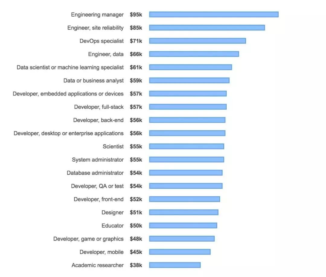 如果按照职位来划分,薪水又会出现一些不同。管理岗位的薪水肯定会略高一些,其余基本与市场需求相对应,DevOps 专家的薪水可以达到 71k 美元,数据或者机器学习专家的薪水可以达到 61k 美元,全栈开发者的薪资为 57k 美元,后端开发者略低一些为 56k 美元。
