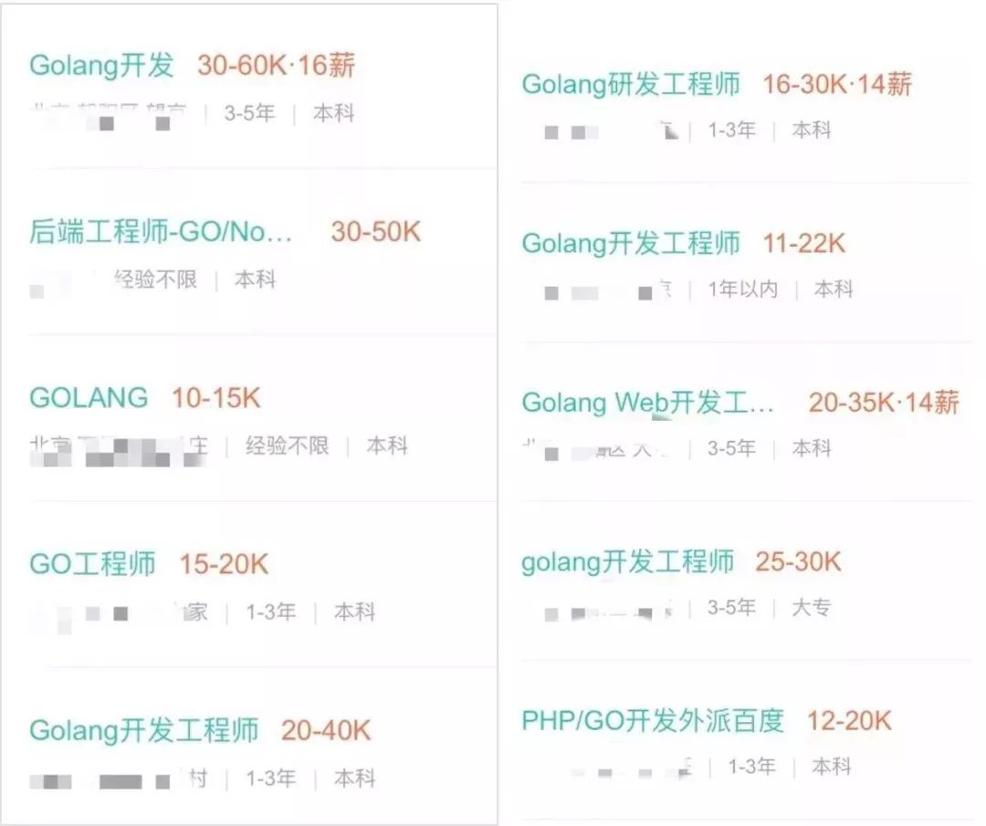 国内整体的薪资水平要略低于全球,需求量较大的依旧是 Java、Python 这类语言。如果与全球薪资较高的编程语言比的话,如果对国内主流招聘网站进行统计,以“Go 语言”为关键字在全国范围搜索,热门地区(北上广深等需求量较大的城市)月薪基本集中在 15-30k 人民币之间,一线互联网大厂的薪酬确实更具竞争力,比如 BAT、高德、奇虎 360、滴滴等,不仅给出的月薪更高(25-60k 之间浮动),不少还明确标出可以给 14 至 16 个月的薪水,而所要求的工作经验基本都在 3 到 5 年。
