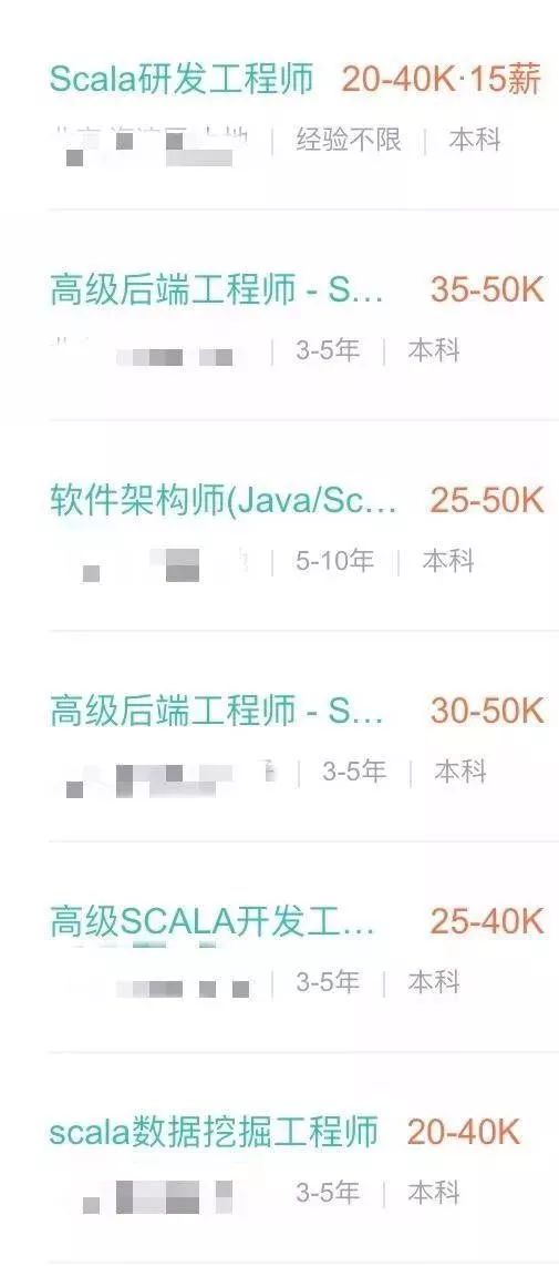 至于 Scala 语言,整体薪水确实比 Go 语言略高一些,在没有筛选的情况下,首页出现的大部分薪资集中在 20-50k 之间,这一结果倒是与全球的调查报告相匹配。