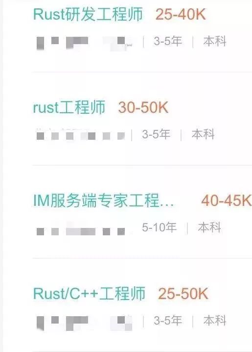 国内对于 Rust 的招聘需求并不旺盛,可搜寻到的岗位不到 Go 语言的十分之一,只比 Clojure 好一些,基本是规模较大的企业对此才有招聘需求,比如今日头条、滴滴等,给出的薪资倒是还算优厚,月薪基本集中在 25k 人民币以上。