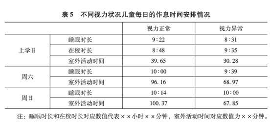 就儿童本身而言,调查发现,在身体发展指标方面,儿童睡眠时间越短、室外活动时间越短,儿童体质指数(BMI)就越高,也就意味着儿童肥胖的可能性越大。儿童睡眠时间越长、室外活动时间越长、使用电子产品时间越短,儿童视力就越正常,近视程度也就越低。