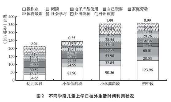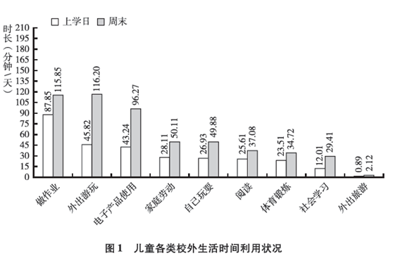 蓝皮书调查显示,在上学日,平均每个儿童的校外生活时间分配中,花费时间最多的类别是做作业(包括学校作业、课外班作业、家长布置的作业、其他作业),占时87.85分钟(其中学校作业平均占时62分钟)。其次是外出游玩(45.82分钟),其中,占时最多的是去公园、小区露天场所等公共场所(18.59分钟)。再次是电子产品使用时间(43.24分钟),其中,利用电子产品娱乐时间(包括抖音、动画片、快手等)最长(16.60分钟),进行学习(包括电子书、App学习、网络课程等)的时间为13.90分钟,利用电子产品玩游戏、网络聊天(包括网络游戏、QQ、微博、微信等)的时间为12.75分钟。