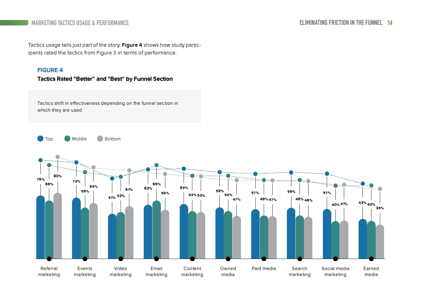 尽管如此,营销人员知道某些策略比其他策略效果更好。对漏斗顶部来说,推荐营销(76%)、事件营销(73%)、内容营销(64%)、搜索营销(59%)、自有和付费媒体(59%和57%),以及社交媒体营销(57%)的评价更好或最好。