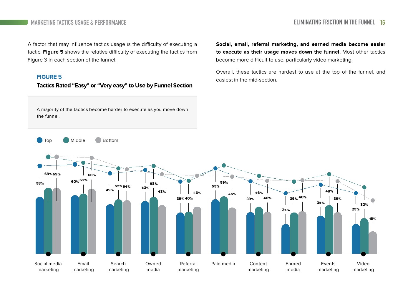 营销人员了解某些策略在漏斗的不同阶段的有效性,但这并不意味着他们能轻易地使用这些策略。事实上,尽管漏斗顶部的最佳策略是推荐、事件和内容营销,但最常用的策略却是电子邮件营销、自媒体和事件营销。对漏斗底部最有效的策略是推荐、事件和视频营销,但营销人员最常用的确实电子邮件、事件和推荐营销。