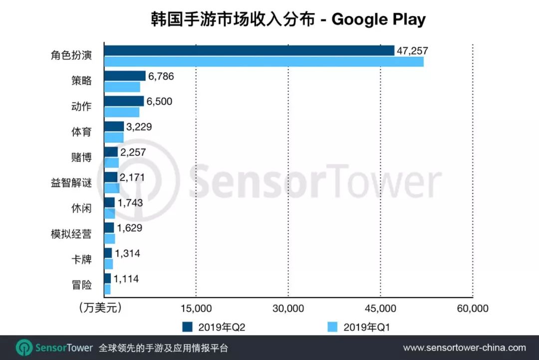 受本土手机品牌影响,韩国手游市场以Google Play商店为主导。因此我们以 Google Play 为切入点分析韩国手游市场构成。从下图可见,过去一年手游收入方面,仍以RPG手游为主导,该类别在Q2手游收入中占比达62%。正如前文提到的收入榜头部多款手游业绩下滑,且这些手游多数属于RPG游戏,这一类别的市场表现是韩国手游整体收入下降的主因。