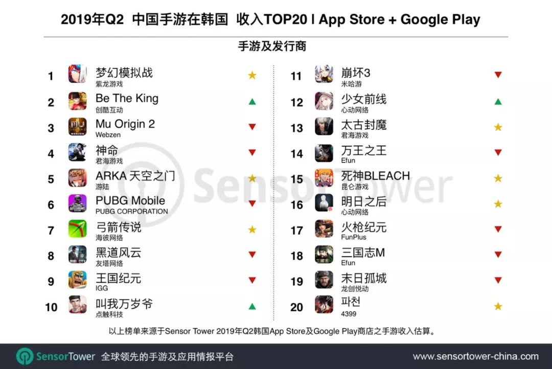 Q2中国手游在韩国市场依然十分活跃,多款新品入围收入榜和下载榜。紫龙游戏《梦幻模拟战》6月在韩国市场发行,Q2吸金超过1500万美元,位列韩国手游畅销榜第8名,并一举拿下Q2国产手游收入冠军。创酷互动《Be The King》排名上升1位至第2名,点触科技《叫我万岁爷》成功挤入前十。