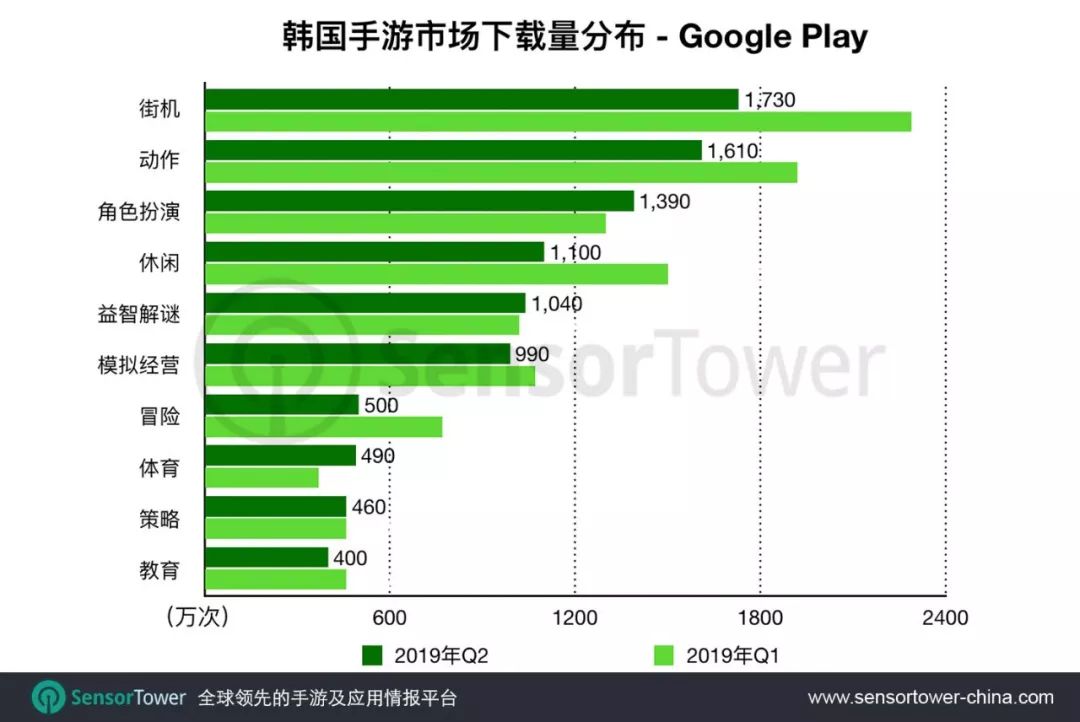 下载量方面,同样显示出韩国手游玩家对重度游戏的热爱。超休闲游戏在韩国市场没有显著的吸量优势,街机,动作,RPG和休闲游戏Q2下载量占比分别为16%,15%,13%和10%。且街机和休闲游戏的下载量对比Q1显著下滑。