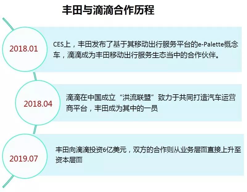 7月25日,滴滴出行宣布与丰田汽车公司在智能出行服务领域拓展合作。丰田将对滴滴进行投资,其中部分资金将用于双方与广汽丰田汽车有限公司共同成立合资公司,为平台司机提供汽车相关服务,投资总额共6亿美元。