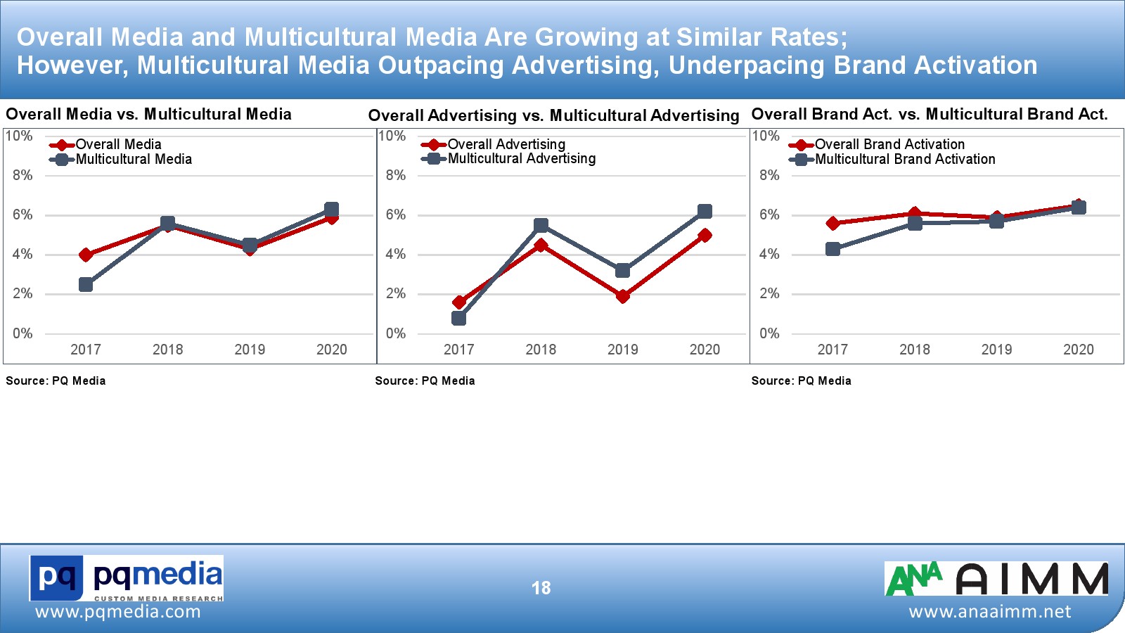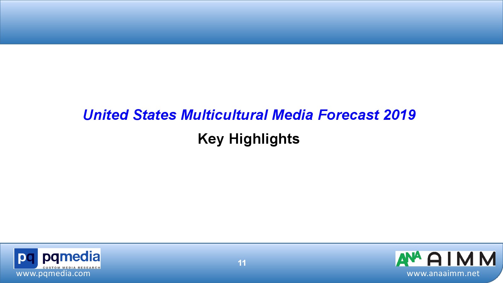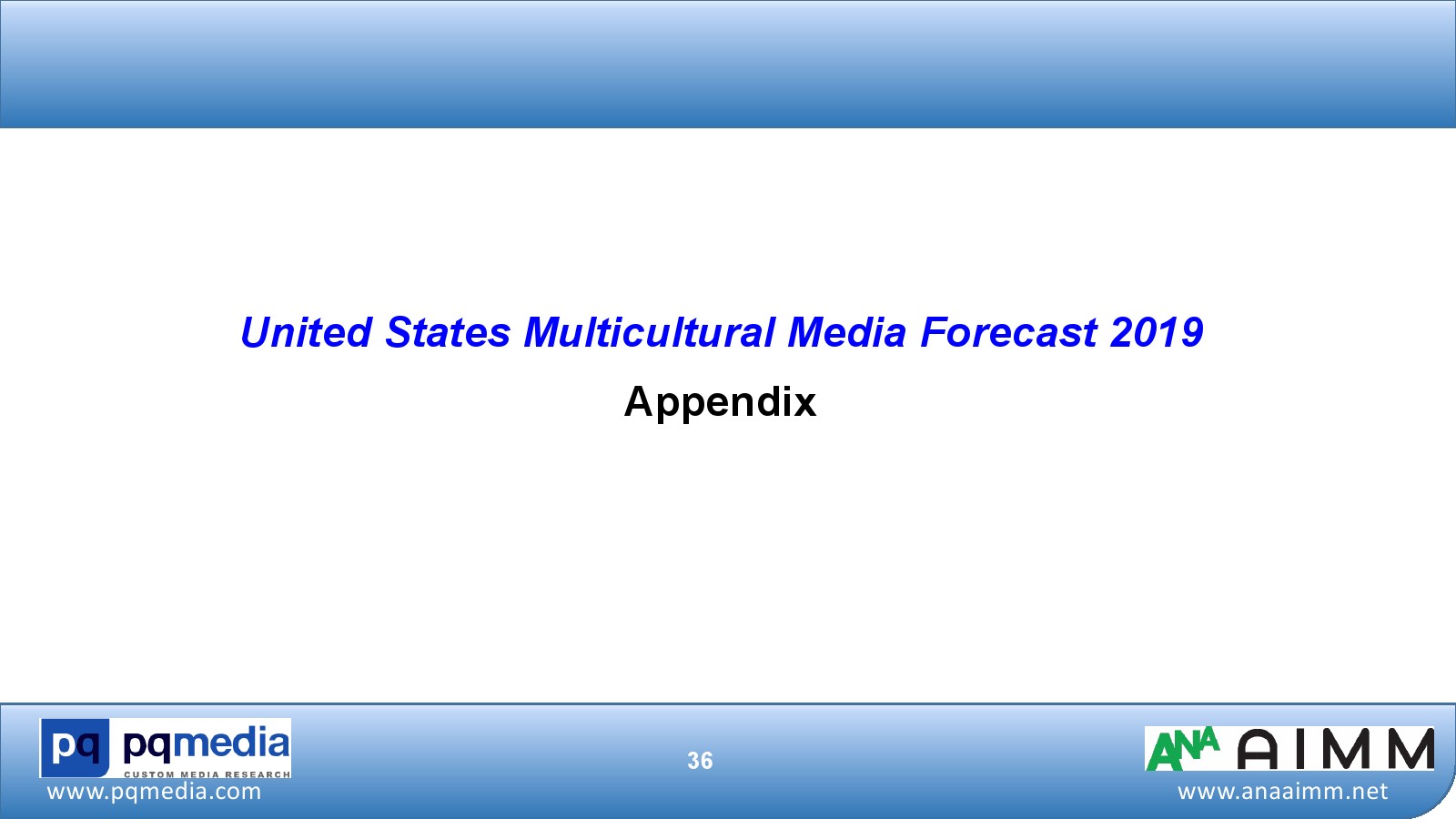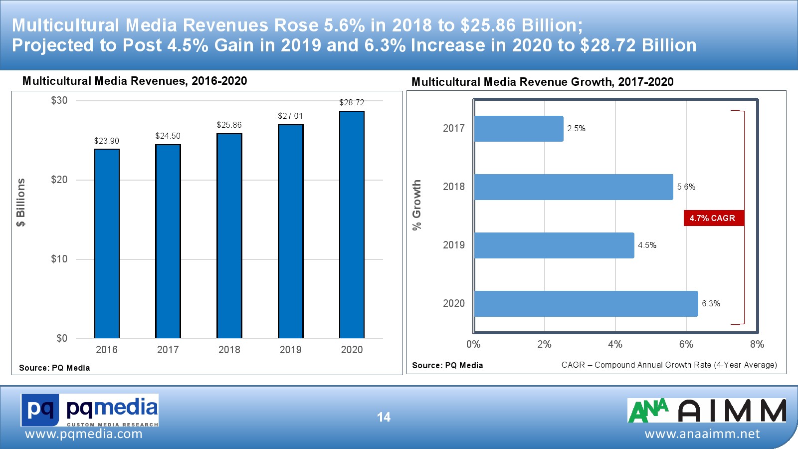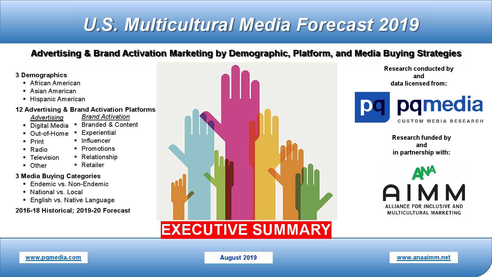 根据PQ Media和ANA的一份报告,多文化媒体支出去年增长5.6%,达到259亿美元。虽然今年多文化广告支出的增长预计将放缓至4.5%,但增长率将在2020年迅速回升,预计将增长6.3%,达到287亿美元。