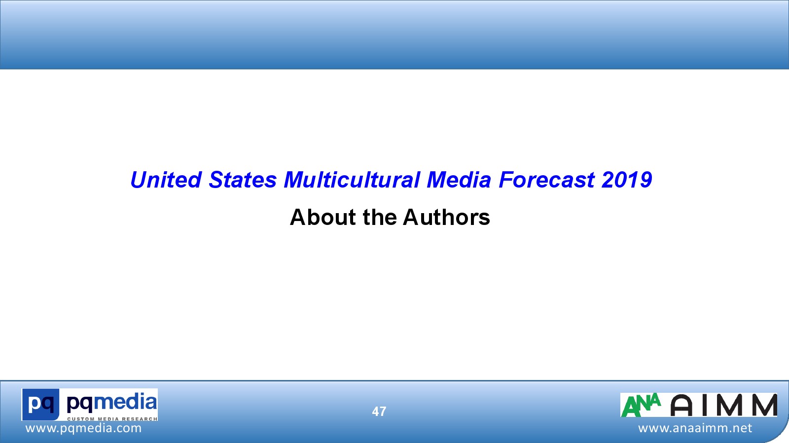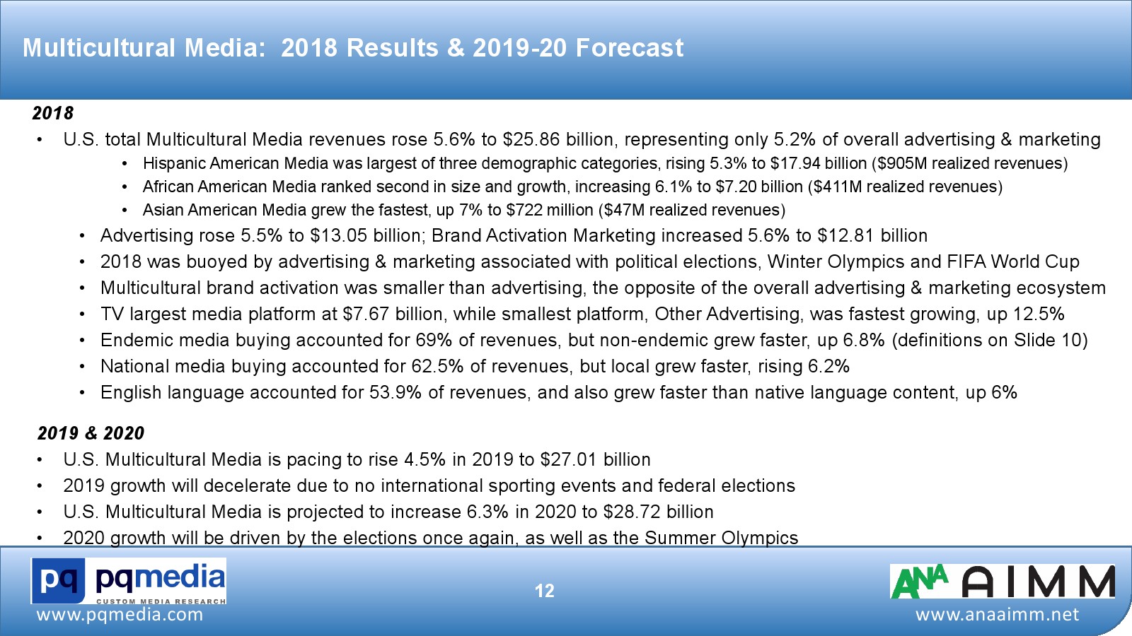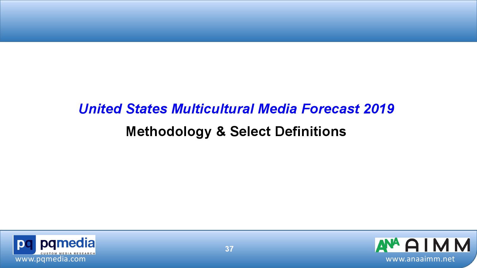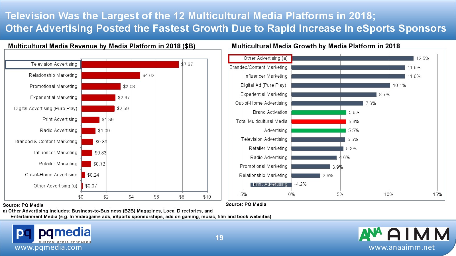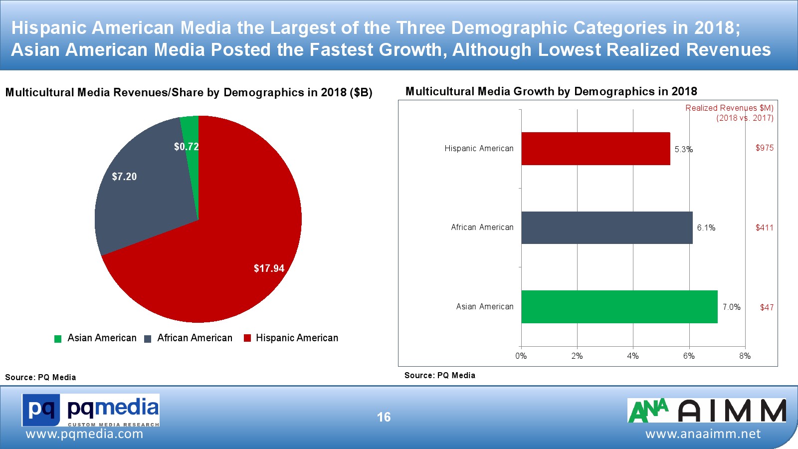 根据PQ Media和ANA的一份报告,多文化媒体支出去年增长5.6%,达到259亿美元。虽然今年多文化广告支出的增长预计将放缓至4.5%,但增长率将在2020年迅速回升,预计将增长6.3%,达到287亿美元。