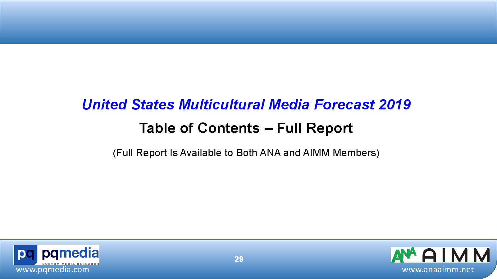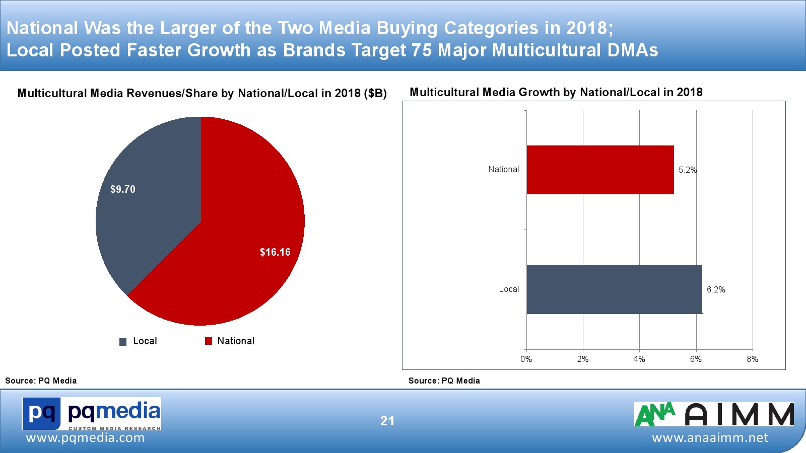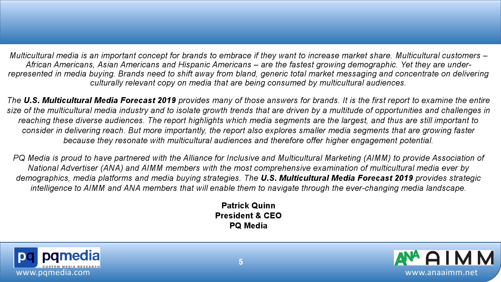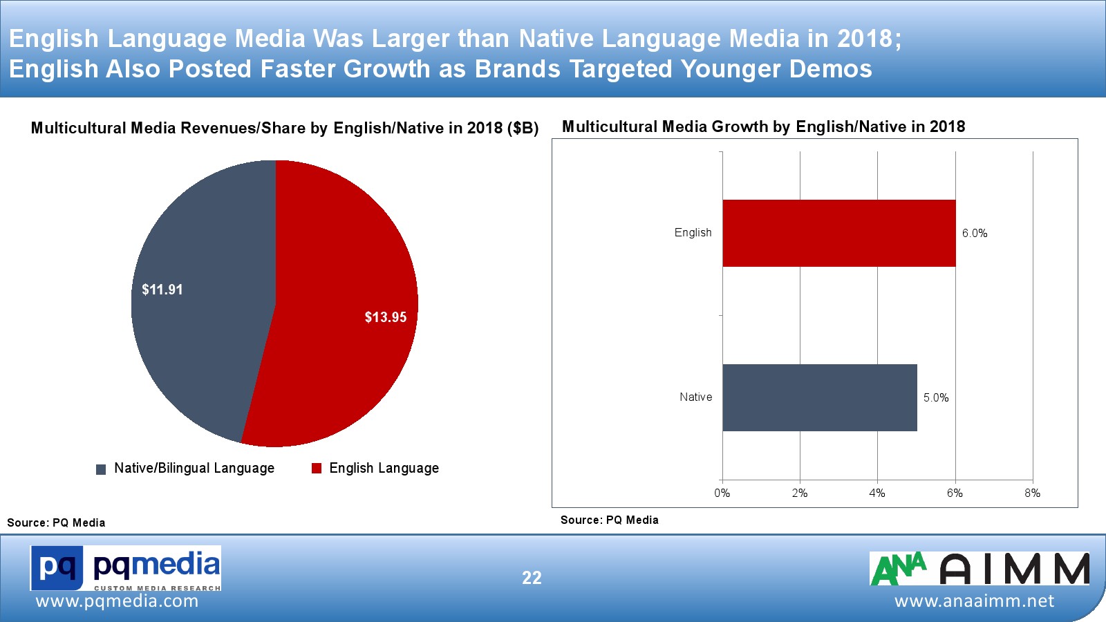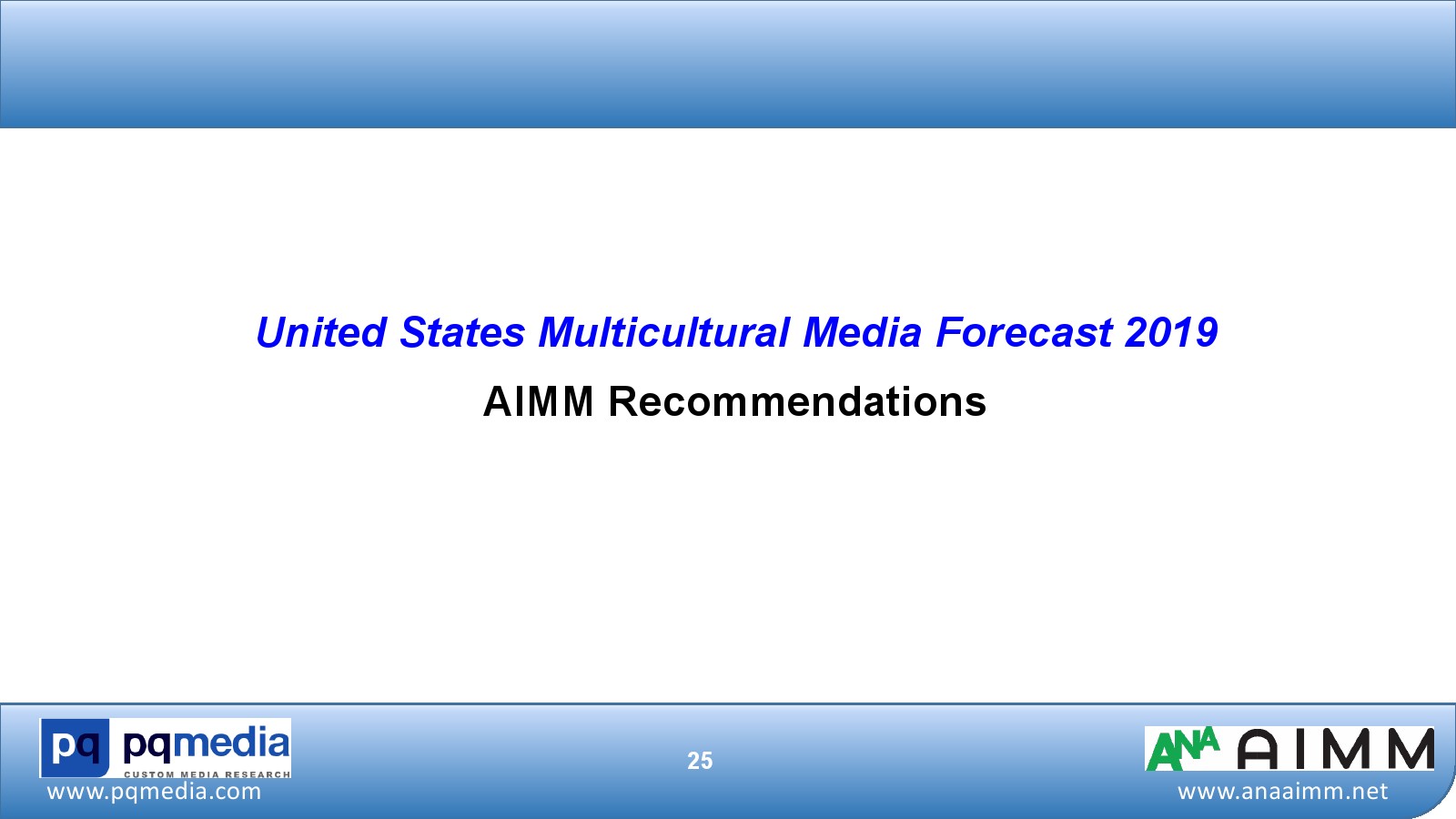 根据PQ Media和ANA的一份报告,多文化媒体支出去年增长5.6%,达到259亿美元。虽然今年多文化广告支出的增长预计将放缓至4.5%,但增长率将在2020年迅速回升,预计将增长6.3%,达到287亿美元。