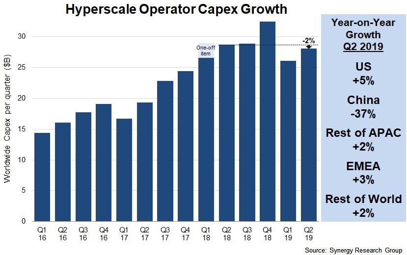 Synergy Research的新数据显示,第二季度超大规模运营商资本支出突破280亿美元,比第一季度大幅上升,但与去年创纪录的水平相比下降了2%。