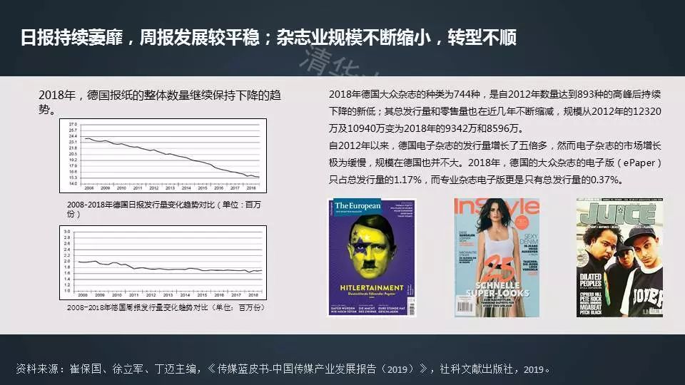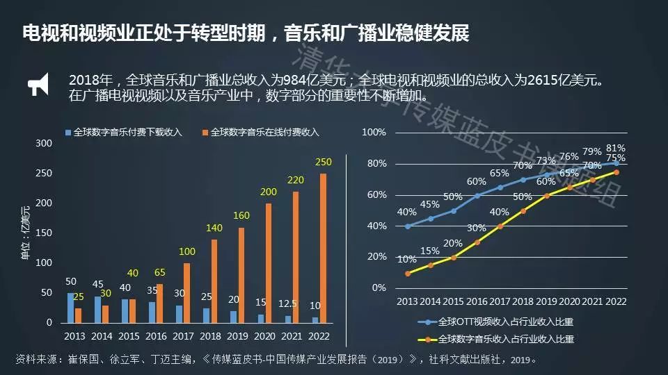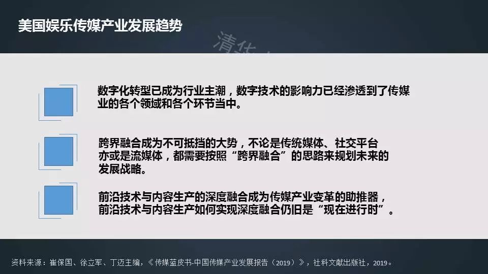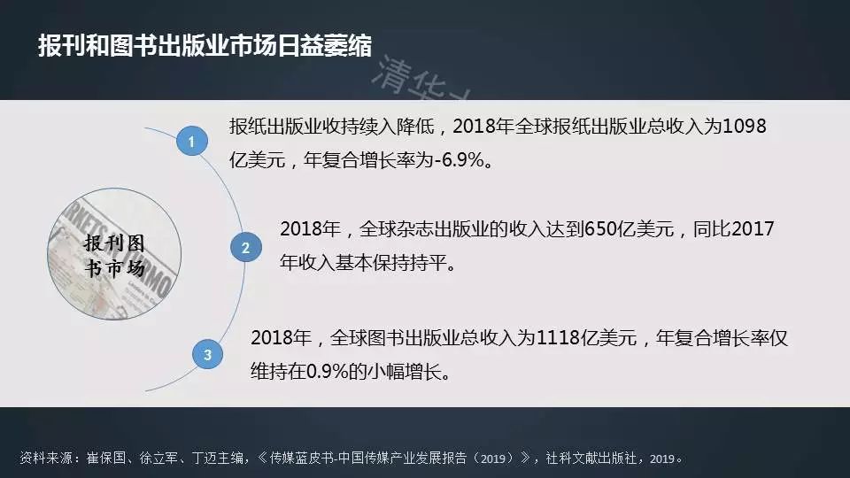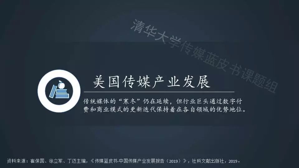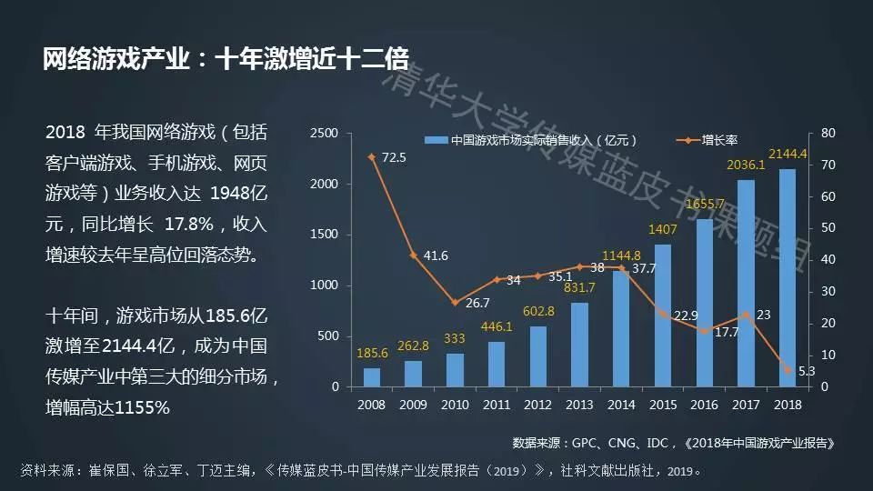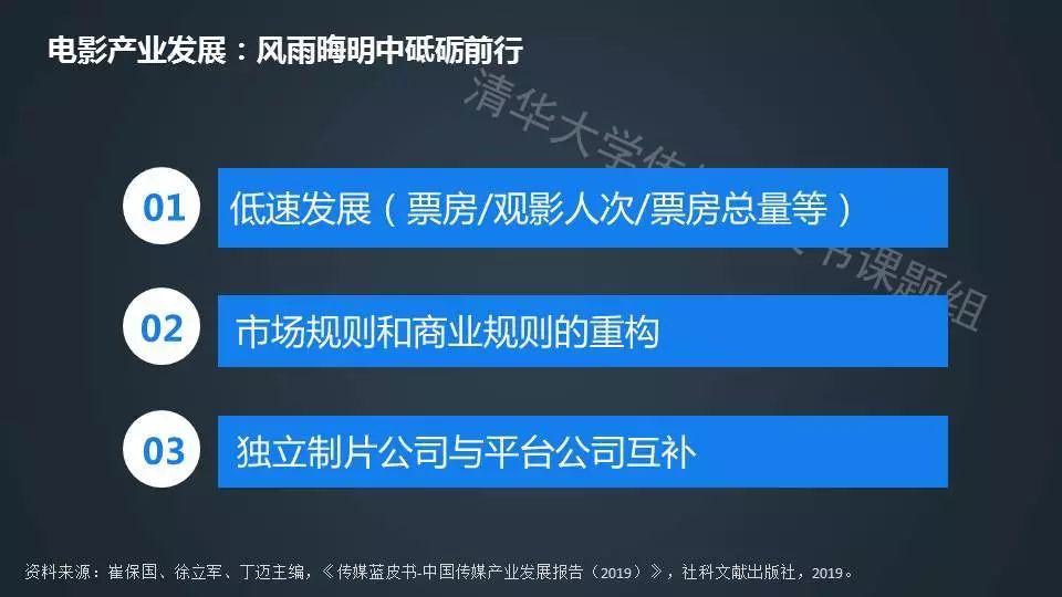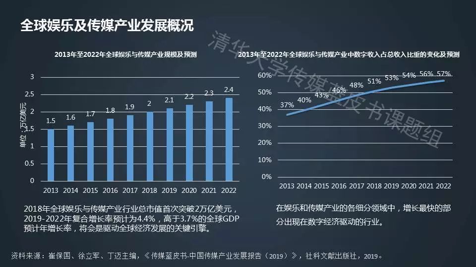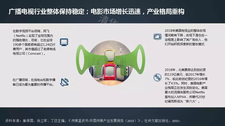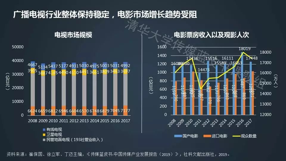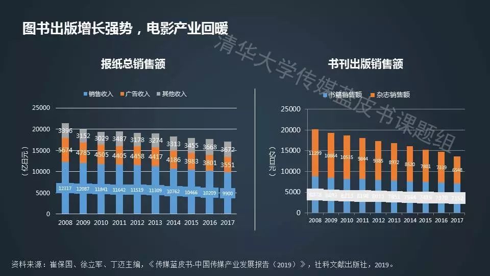 第二,中国传媒产业的发展速度稳中放缓,放缓的主要原因是受到宏观经济调整期的影响,也受到国家传媒政策改革和内容规制调整的影响。