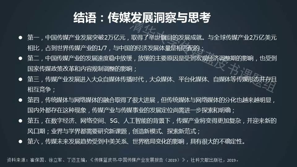 第五,在数字经济、网络空间、5G、人工智能的背景下,传媒产业将变得更加复杂,并迎来新的风口期;业界与学界都需要研究新课题,创造新模式、探索新范式。