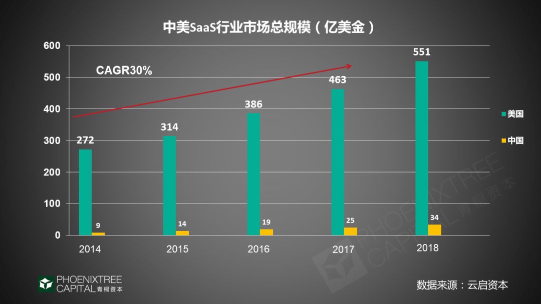 另外,来自安信证券《风起云涌看 SaaS——中国 SaaS 行业有望迎来跨越式发展》报告也指出,国内 SaaS 行业整体发展落后美国 10 年左右。国内SaaS市场预期与发展模式,一直以来参照美国SaaS市场。必须看到,美国SaaS 产业已进入成熟期,才逐渐出现了Salesforce、Workday等巨头。中国SaaS厂商,面临独特的国内市场环境,移动化的普及、电商的发展等机遇,无疑将在本土化方面有更大的发展空间。