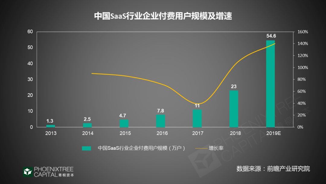 在企业对SaaS的付费意愿方面,2019年我国企业SaaS付费用户规模预计将超过54.6万户。据前瞻产业研究院数据显示,2018年企业SaaS付费用户规模已达23万户,与2017年相比,增速达109%;对比2013年的1.3万户,五年复合增长率高达78%。无疑,国内企业用户对SaaS服务模式认可度提升,SaaS的商业化和盈利将更有空间。
