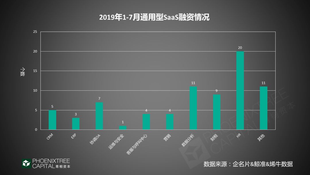 从通用型SaaS的细分类型来看, CRM市场规模最大,约占通用型SaaS 20%;其次为客服与呼叫中心占15%、ERP和通信SaaS各占11%。而从资本青睐角度,2019年截至7月,通用型SaaS累计有75起融资事件中,HR、数据分析、财税SaaS这三个细分赛道更受资本关注。