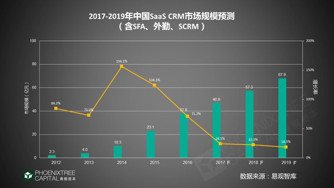 CRM是SaaS行业中率先发展起来的赛道,核心价值在于导流,帮助企业加强销售管理,提升销售效率,能够直接增加收入,因此企业客户付费意愿强。来自Analysys易观报告《中国SAAS CRM市场规模趋势预测2017-2019》预测,2019年中国SaaS CRM市场规模将达到67.9亿元人民币,而在2015年其市场规模仅有23.1亿。