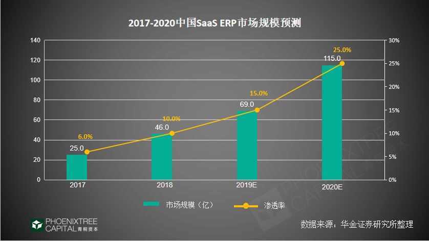 ERP的产品线相对较长,流程全面,涉及企业采购、生产、仓储、销售等多个部门,相比于其他通用型SaaS,定制化程度较高,开发周期较长,因此其SaaS化进程相对较慢。据华金证券研究所预测,2020年我国SaaS ERP市场规模将接近115亿元,SaaS ERP 渗透率达到25%。