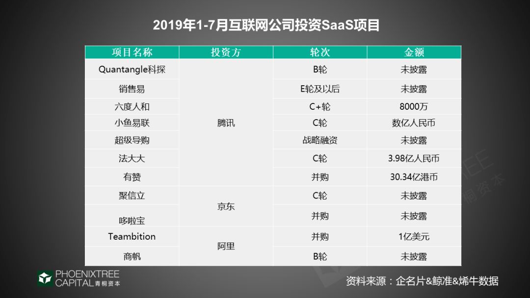 青桐资本研究发现,2019年1-7月互联网巨头在SaaS领域频繁出手,其中腾讯完成7起投资;阿里、京东各投资了2起。