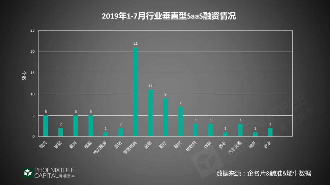 2019年1-7月SaaS行业累计发生158起融资事件,青桐资本研究发现,SaaS赛道自2018年回暖以来,呈现持续增长态势,2019年市场整体继续向上。