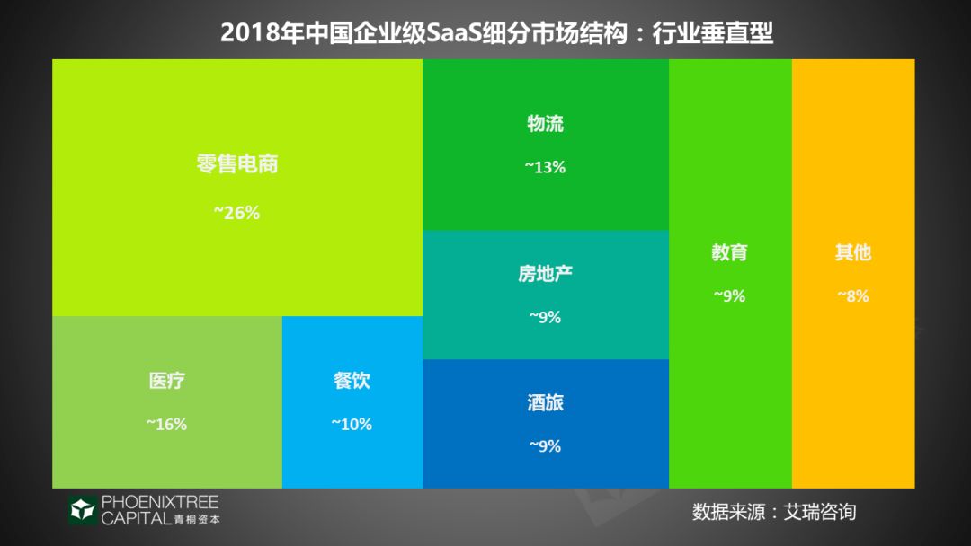据艾瑞咨询数据,2018年行业垂直型SaaS市场规模达到103.3亿元。零售电商、医疗、物流和餐饮行业SaaS市场份额位列前四,其中,零售电商SaaS市场规模居首,占比26%。无疑,这些行业都是与C 端用户紧密结合,也是互联网最先开始渗透的行业。
