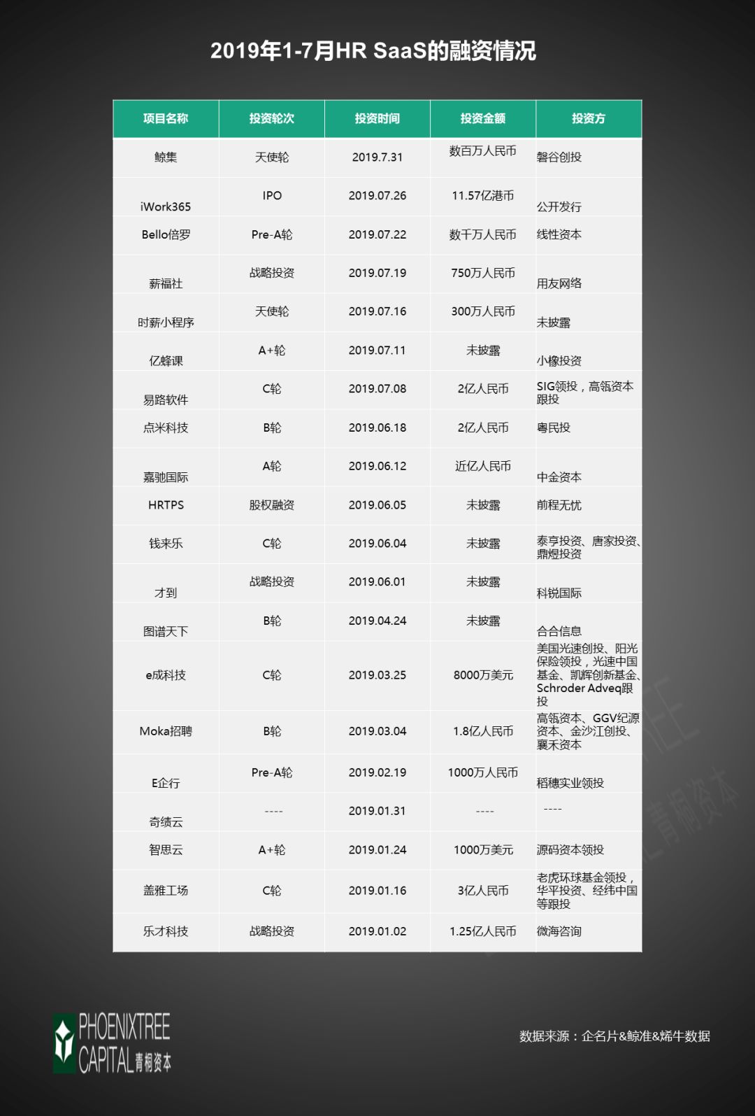从融资市场,来自艾瑞咨询数据显示,2017-2018年,HR SaaS获得融资数量最多,有55个;青桐资本梳理2019年1-7月的投融资数据发现,HR SaaS有20个项目获得融资,位居通用型SaaS融资数首位。并且,其项目都在B轮及以后,更偏中后期。