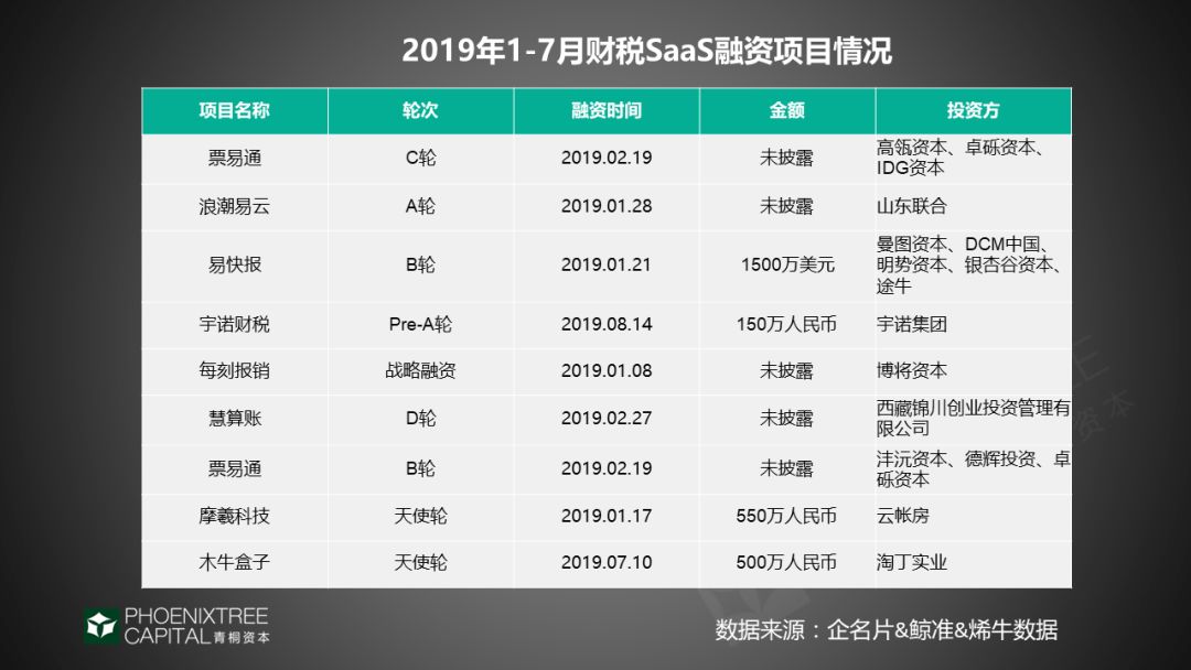 从投融资数据看,2019年1-7月财税SaaS,有9个项目获得融资,中后期项目偏多。