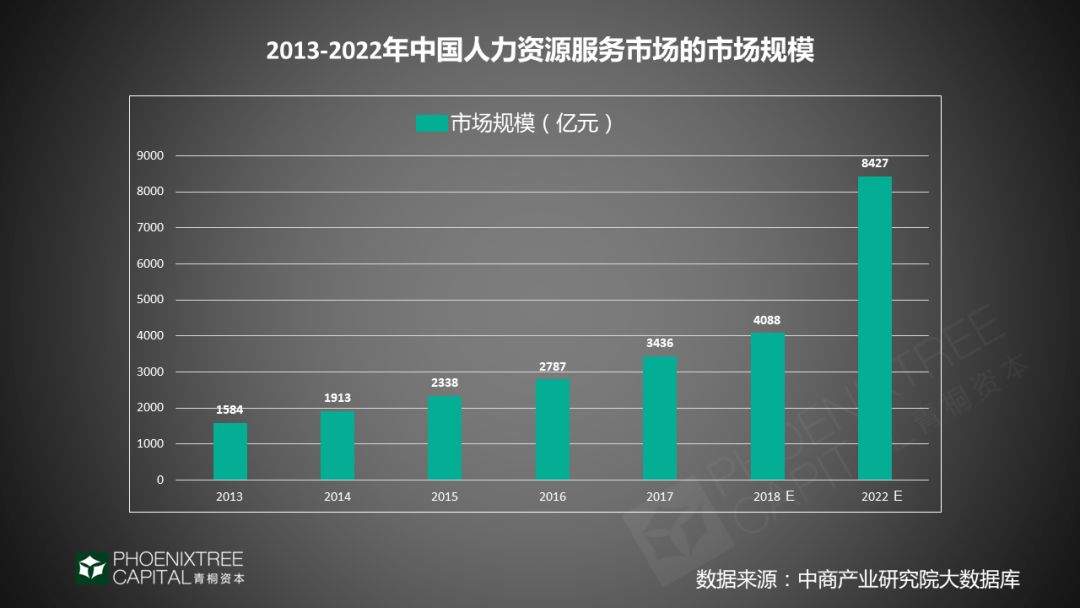HR SaaS无疑是资本的香饽饽。来自中商产业研究院数据,我国人力资源服务市场的规模由2013年约1584亿元增至2017年3436亿元,复合年增长率为21.9%,并预期于2022年增至8427亿元。