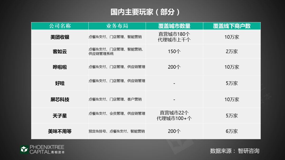 餐饮SaaS行业进入红海,服务商们的竞争程度异常激烈。主要玩家有:客如云,已经登陆新三板,覆盖超2万家店铺,百度入股;屏芯科技,覆盖超10万家店铺 ,获美团投资;二维火,获阿里巴巴战略投资,覆盖近30万家店铺;集 BAT 三家融资于一身的美味不用等,覆盖6万多家店铺等。不难发现,餐饮作为巨大的流量入口,其SaaS吸引互联网巨头的布局。