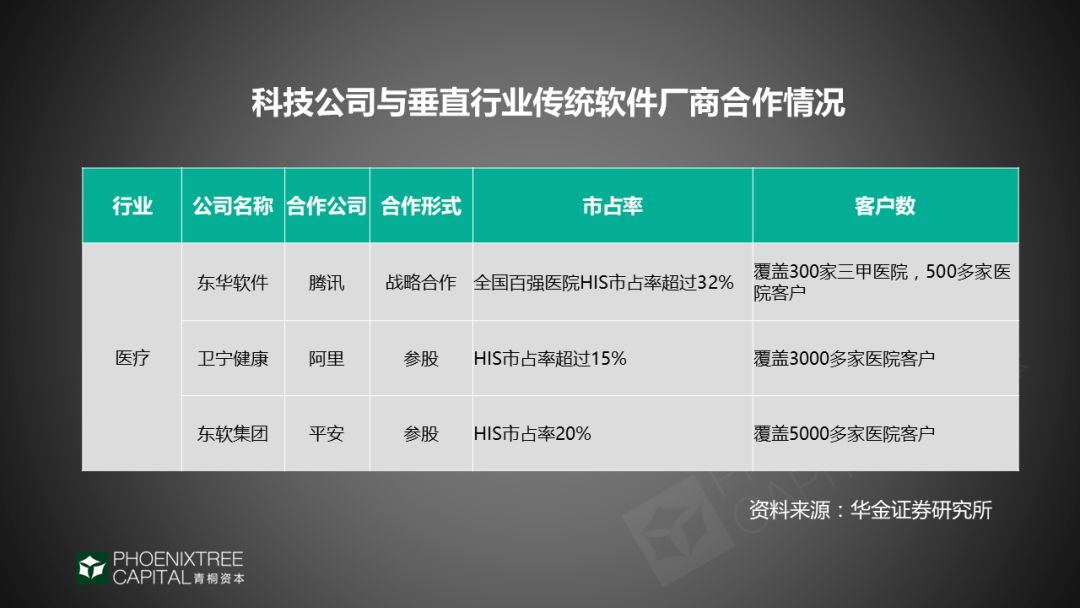 医疗SaaS赛道格局比较清晰。主要玩家集中在上市公司,有:东华软件、卫宁健康和东软集团等,占据了市场主导地位。并且科技巨头阿里和腾讯以战略合作、参股等形式介入。